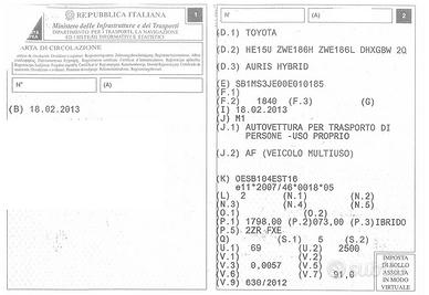 RICAMBI TOYOTA AURIS 1.8 HYBRID ANNO 2013