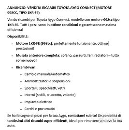 Ricambi Toyota Aygo connect cc.998 tipo 1kR FE con cambio automatico perfettamente funzionante con km 110.000 e tanti altri ricambi efficienti. vedi lista ricambi sfogliando le foto per altre info tel 3509244236
