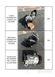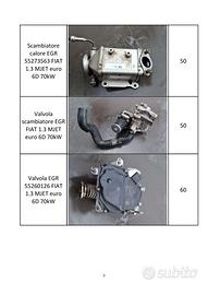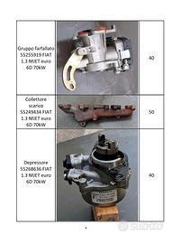 Vendo ricambi usati (90000km) per motore FIAT 1.3MJET 330A1000 70kW euro 6: - Testata per motore 330A1000 da revisionare || 150€ - Scambiatore calore olio 55255370 || 80€ - Collettore aspirazione FIAT 55231286 || 50€ - Turbina 55270995 || 300€ - Alternatore 51993603 || 100€ - Compressore A/C 52003007 || 150€ - Scambiatore calore EGR 55273563 || 50€ - Valvola scambiatore EGR || 50€ - Valvola EGR 55260126 || 60€ - Gruppo farfallato 55255919 || 40€ - Collettore scarico 55249434 || 50€ - Depressore 55268636 || 40€ Contattemi per foto in qualità migliore.