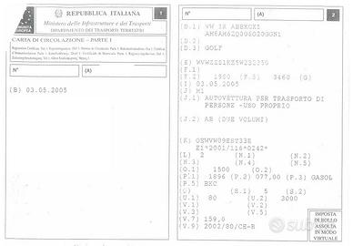 RICAMBI VOLKSWAGEN GOLF 4x4 1.9 TDI ANNO 2005