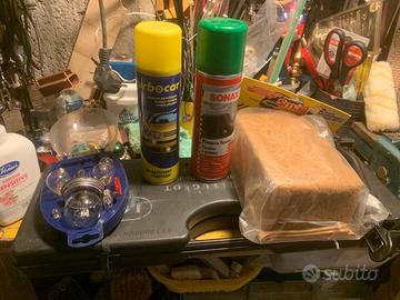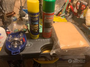 Due bombolette per pulire gli interni e i fascioni in plastica , un triangolo auto, spugna più panno in daino,ventosa porta telefino , lampadine e fusibili di cambio
