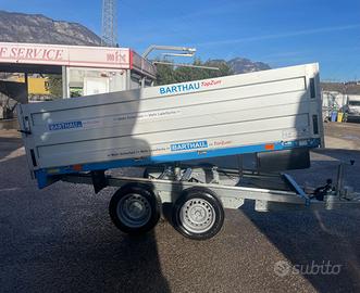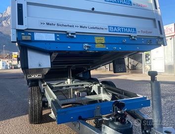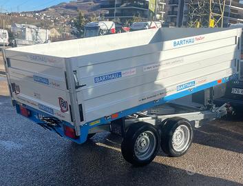 doppio asse. Timone a V. Dimensione carico 3010x1700. Pneumatici 195/60/R14. Cassone ribaltabile con pompa idraulica manuale. Pianale multi strato 15mm. Doppie sponde in alluminio (700mm). Bauletto incorporato