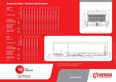 Rimorchio olandese brand Henra specifico per trasporto di piattaforme a pantografo. Telaio completamente saldato e riprogettato nel 2020. Altezza pianale da terra 35 cm. Rampa maggiorata. da 165 o 215 cm Pianale in Plywood, alluminio o grigliato. Portate utili fino a 2823 Kg. Si predilige il contatto telefonico, si riceve previo contatto telefonico mail e messaggi incompleti non vengono considerati.