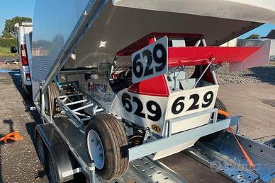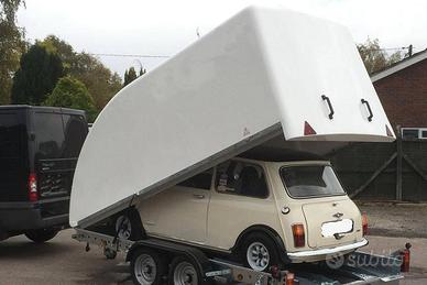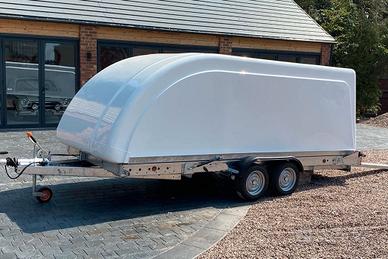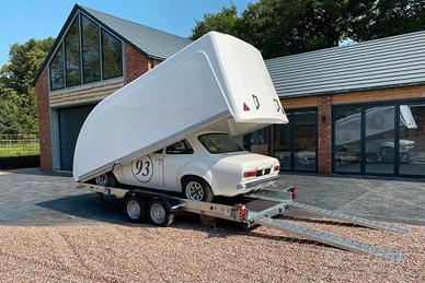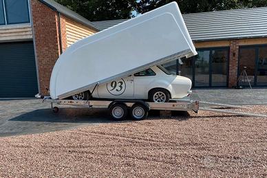 Rimorchio professionale per trasporto auto di piccole dimensioni: Kart, auto d'epoca, sportive, classiche, prototipi ecc. Con chiusura in materiale composito monopezzo senza guarnizioni esterne. Apertura tramite pistoni a gas ad alta pressione.