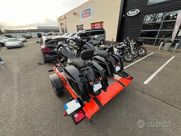 Rimorchio Cochet Maxi Duo abbassabile e ripiegabile versione frenata Piano di carico utile 256 x 160 cm. consente di avere un carico utile di 950 kg. e di caricare: 2 Harley Davidson — 2 Goldwing —- 2 BMW GS allestite —- Harley Davidson trike ecc Con l’esclusività di un rimorchio ripiegabile salvaspazio!