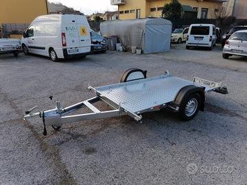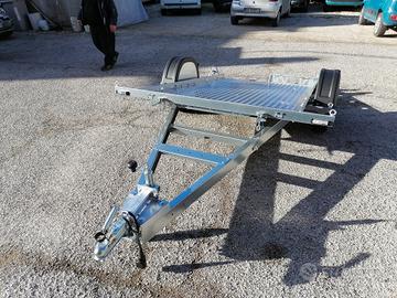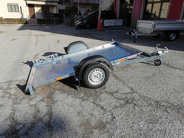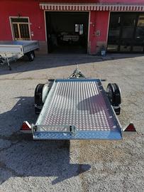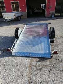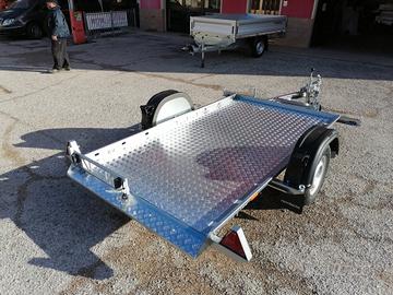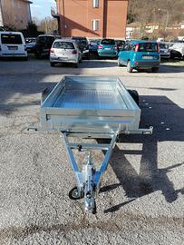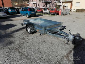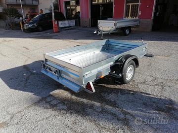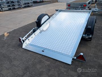 Rimorchiocon movimento basculante. Mini rampa integrata al pianale. Misurautile pianale cm 240*140*30. Pianale rivestito, luci ingombro,spondina in lamiera con asole per fissaggio carico+sponde in lamieraamovibili. Ruotino telescopico, timone a V. Disponibile versione con freni, 750 kg pieno carico. Pianale 300*150, senza freni. Pianale 300*1500, con freni, peso pieno carico da kg 800 a 1300.
