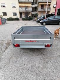Rimorchio trasporto cose CON FRENI. Sponda da 35 cm amovibili in lamiera. Peso a pieno carico kg 750, Dimensioni cassone cm 200*145. Timone a V, freno stazionamento, paraspruzzi ruote, ganci interni ed esterni ancoraggio carico, pianale rivestito in legno marino.