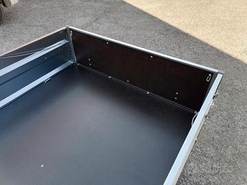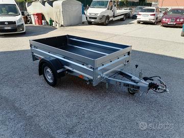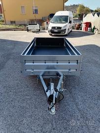 Rimorchio nuovo con freni, sponde in lamiera rimovibili con pomelli fissaggio copertura, sponda anteriore ribaltabile, sponda posteriore rinforzata. Freni, freno stazionamento, timone a V, ruotino telescopico. Pianale basculante. Paraspruzzi ruote. Luci ingombro. Ganci esterni. Piano di carico rivestito e ganci ancoraggio. Peso a pieno carico kg 750.