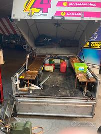Carrello targato umbra rimorchi chiuso con doppia apertira posteriore. Attalmente attrezzato trasporto kart. Puo caricare tranquillamente un kz smontando solamente il paraurti anteriore. Sotto al kart posto per il carrellino e porta gomma zona anteriore. Gia cablato per aria compressa. Ultima revisione effettuata frbbraio 2025. Freni ok e luci posteriori nuove. Pronto a partire subito nessun lavoro da fare.