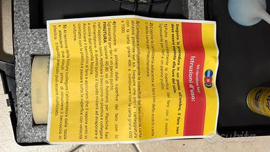 Attrezzatura kit ripristino fari in plastica completi dí liquido polimero , spray pulitore professionale per fari in plastica, tazza riscaldante elettrica con trasformatore, set carte abrasive, e istruzioni allegate conpleta di valigetta.