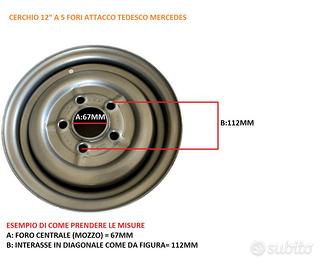 abbiamo messo una foto di come prendere le misure dell'attacco del mozzo , Ruota completa per carrello e rimorchio 155/70-12C (da carico) attacco 5 FORI X 67 X 112 INTERASSE CANALE DA 4.5 X 12