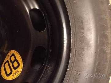 Vendo ruota di scorta completa (cerchio in ferro + pneumatico) in condizioni impeccabili, mai montata. Lo pneumatico presenta ancora i segni colorati di fabbrica sul battistrada.