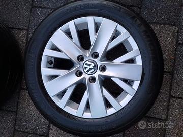 Vendo serie 4 ruote con cerchi in lega originali VW 5K0601025AL misure 6,5Jx16 ET50 attacco 5x112, gomme invernali 205/55R16 H (2 Continental + 2 Gialaved 5/6 mm circa con DOT 2015/2018).