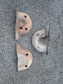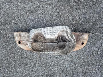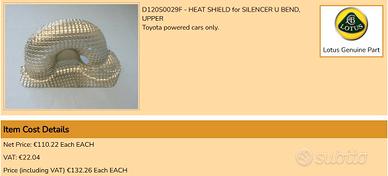 Scudo termico originale, per la curva del catalizzatore, delle Lotus 2-11 o Elise o Exige S2, equipaggiate con il motore Toyota 1ZZ o 2ZZ (versioni dal 2004 al 2011). Codice ricambi Lotus: D120S0029F (paratia superiore) o D120S0030F (paratia inferiore). Come visibile in foto, ho disponibili un paio di scudi termici completi (sia della paratia superiore, che inferiore). Prezzo del ricambio nuovo ben oltre 250€ (più di 100€ per singola paratia)!