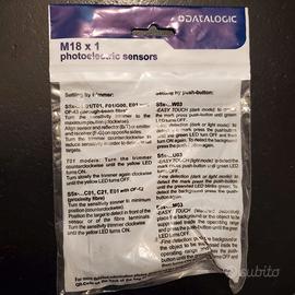 Il secondo è un sensore fotoelettrico tubolare Datalogic S5N‑MA‑5‑C01‑NK, filettatura M18 x 1, alimentazione 10–30 Vdc, uscita NPN NO, connettore M12 4 poli, portata circa 40 cm e grado di protezione IP67, completo di busta originale.