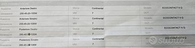 Vendo set di 4 pneumatici estivi per passaggio a 4 stagioni Dettagli pneumatici: Marca: Continental Modello: EcoContact 6Q KM Percorsi: 8000 Spessore battistrada: 7mm (vedere dettaglio in allegato) Anteriori: 2x 255-45-20-105W Posteriori: 2x 285-40-20-108W Pneumatici stoccati presso AutoTorino a Tavagnacco (UD) Possibile acquisto: 2x anteriori (255-45-20) -> 200€ 2x posteriori (285-40-20) -> 300€ In blocco -> 500€