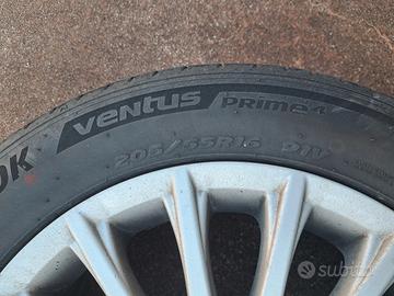 Set di 4 cerchi per Alfa Romeo con gomme estive Hankook ventus prime 4 misura 205/55 R16 91V. Buone condizioni come da foto, no segni da parcheggio, (le foto rappresentano ogni singolo cerchio) pneumatici con pochissima usura. Ritiro a mano, no spedizione.