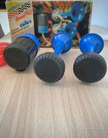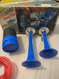 Set trombe Fiamm Grand Prix CST/2 12V Tipo T/2 completo di trombe, raccordo per aria, tubo aria in gomma, relè, portafusibile, compressore Fiamm Tipo CS 12V, staffe di supporto e bulloni per fissaggio, istruzioni di montaggio. Nuovo, nella sua confezione originale.