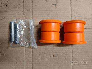 I silent block sono composti da due pezzi ciascuno, completi di boccola interna, e non necessitano di attrezzi specifici per il montaggio. Essendo in poliuretano sono più rigidi rispetto ai classici ricambi in gomma, ma garantiscono una risposta più precisa della sospensione.
