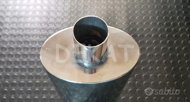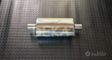 Silenziatore in acciaio inox 409, per costruzione artigianale scarichi auto. Questo tipo di silenziatori sono utilizzati solitamente come centrali, per abbassare il tono generale dello scarico. Vale la regola generale secondo cui più sono grandi più silenziano. Ovviamente aumentando il volume della pancia, aumenta anche la quantità del materiale fonoassorbente all'interno, e la conseguenza è un abbassamento migliore del rumore. Le versioni di forma ovale sono generalmente più efficienti, proprio perchè hanno un volume maggiore rispetto alla controparte rotonda.