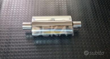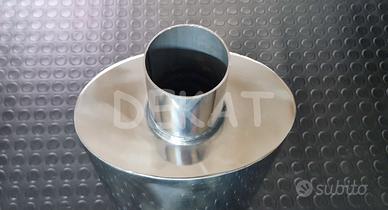 Silenziatore in acciaio inox 409, per costruzione artigianale scarichi auto. Questo tipo di silenziatori sono utilizzati solitamente come centrali, per abbassare il tono generale dello scarico. Vale la regola generale secondo cui più sono grandi più silenziano. Ovviamente aumentando il volume della pancia, aumenta anche la quantità del materiale fonoassorbente all'interno, e la conseguenza è un abbassamento migliore del rumore. Le versioni di forma ovale sono generalmente più efficienti, proprio perchè hanno un volume maggiore rispetto alla controparte rotonda.