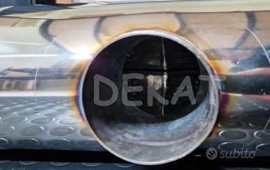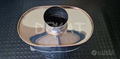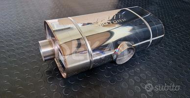 Silenziatore in acciaio inox 304, per costruzione artigianale scarichi auto. Questo tipo di silenziatori sono utilizzati solitamente come finali, per abbassare il tono generale dello scarico e per sdoppiare la linea di scarico in modo da realizzare la doppia uscita DX / SX. L'ingresso centrale è da 76 mm, mentre le due uscite laterali sono da 63 mm.