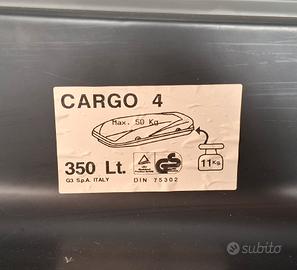Vendo siluro Cargo 4 G3, ottime condizioni.. Funzionante in tutto, lievi segni di utilizzo, comunque usato poco, doppia copia delle chiavi, serrature perfettamente funzionanti, ganci di attacco compresi. Prezzo non trattabile.. Ritiro nel mio domicilio.
