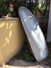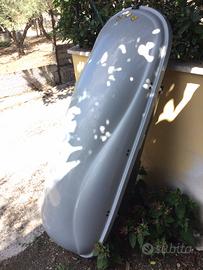 Siluro portapacchi in buono stato lunghezza 1,90 x 0,75 l’oggetto come verniciatura grigio metallizzato si presenta bene manca la chiave di chiusura e ha una riparazione all’interno sul fondo. Tenuta salda sulle barre da tetto con poche mosse può tornare come nuovo per chi è un tuttofare.Il prezzo è trattabile.