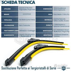 2 Spazzole Tergicristallo GOODYEAR per Mercedes Classe B Parabrezza Anteriore | Lama Piatta Aerodinamica - Flat Blade, in Gomma Naturale Trattata con Teflon e Grafite - ECCELLENZA GARANTITA | Materiali di Altissima Qualità, NEW Technology: Gomma Naturale al Teflon + Grafite, struttura Interna d' Acciaio. - PULIZIA PERFETTA | Struttura Interna in Acciaio permette l'adattamento della Lama su ogni parabrezza, per una PULIZA SUPERIORE a quella di Serie. - DURATA NEL TEMPO | Nuovissimo Trattamento della Gomma Naturale con Teflon e Grafite permette l'esposizione a condizioni Climatiche più Estreme, garantendo il +50% di durata rispetto a spazzole convenzionali. - RUMOROSITA' ZERO | Il Design Aerodinamico Abbatte la Rumorosità, e ne Aumenta la Stabilità ad Alte velocità. IL PACCO INCLUDE: - 2 Spazzole Tergicristallo GoodYear - 9-11 Adattatori Plastici di Montaggio COMPATIBILITÀ: - Per Mercedes Classe B W245 (2005-2011) - Per Mercedes Classe B W246 (2011-2019) - Saranno forniti 9-11 Adattatori, tra cui quello idoneo per la Tua Vettura SCHEDA TECNICA: - Colore: Nero Traslucido - Brand: GoodYear - Materiali: Gomma Naturale, Teflon, Grafite, Acciaio - Tipo: Flat Blade - Trattamenti Lama: Teflonatura, Grafitaggio - Tecnologia di Bilanciamento: Aerodinamica - Tecnologia di Conformazione: Struttura Interna in Acciaio - Resistenza: Freddo, Caldo, Raggi UV, Condizioni Climatiche Estreme - Durevolezza: +50% Rispetto a Spazzole convenzionali - Applicazione: Ad Aggancio con Adattatore - Confezione o Scatolo: Blister Plastico - Condizioni: NUOVO PER INFO CONTATTARE AL 3927091031 ANCHE LINEA WhatsApp OPPURE VIA E-MAIL: rtautoitalia2018@libero.it CONSEGNA: - Effettuiamo Spedizioni 24-48H in TUTTA ITALIA - Ritiro in Sede con Possibilità di Visionare il Prodotto - Vendiamo solo Articoli Nuovi PAGAMENTI: - PayPal - Con Carta - Bonifico Bancario - Alla Consegna con Contrassegno