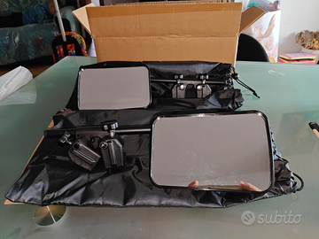 Specchietti universali per auto con roulotte al seguito. Allargano la visuale e sono facili da montare. Oggetto nuovo mai usato, comprende sacca in nylon con chiusura a laccio per ogni specchietto.