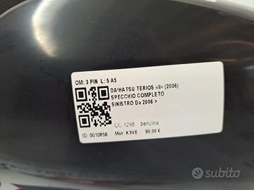 SPECCHIETTO RETROVISORE SINISTRO DAIHATSU Terios 2° Serie 3 PIN SPECCHIO K3VE (06>)
