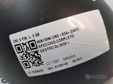 SPECCHIETTO RETROVISORE SINISTRO MINI One 2° Serie 5 PIN SPECCHIO N12B14A (06>13)
