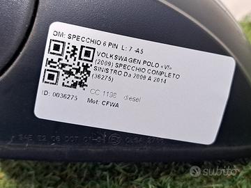 SPECCHIETTO RETROVISORE SINISTRO VOLKSWAGEN Polo 5° Serie SPECCHIO 6 PIN CFWA (09>17)