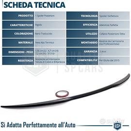 SPOILER Cofano Posteriore per Alfa Romeo GIULIA (dal 2016) | Alettone Posteriore Auto, in ABS Nero Lucido PRONTO ALL' INSTALLAZIONE - NEW LOOK | Conferisce un Aspetto Aerodinamico e Sportivo. - QUALITA' | Rifinito nel Dettaglio, Linee Sottili ed Aderenza Perfetta. - RESISTENZA | New ABS Caratterizzato da, Massima Resistenza a Intemperie e Tenuta di Colorazione e Brillantezza nel Tempo. - FACILE INSTALLAZIONE | Già Verniciato e Pronto all' Uso. INFO: Spoiler in new ABS Nero Lucido, già Pronto all' Installazione. Rinnova il Look Posteriore della Tua Alfa Romeo Giulia, Dona un aspetto Aerodinamico alla vettura, e ne aumenta la Stabilità alle alte Velocità. Qualità eccellente nella scelta dei materiali, Rifiniture del Dettaglio, tatto e colorazione, Pensato e Studiato per una Aerodinamica Migliorativa, ed una Massima Durata e Resistenza nel Tempo. MATERIALE Nuova Miscela di ABS Termico (Acrilonitrile-Butadiene-Stirene), a pigmentazione colorata Nero Lucido, non perde la sua colorazione e brillantezza nel tempo COMPATIBILITÀ: - Per Alfa Romeo Giulia (dal 2016), Tutte le Versioni MONTAGGIO: : Anche se Fornito Biadesivo in Dotazione, Per una Tenuta Perfetta, si Consiglia l'Incollaggio in Carrozzeria con Opportuni Mastici Professionali DETTAGLI TECNICI: - Materiale: ABS di Qualità - Colore: Nero - Finitura: Traslucida - Peso: 580 Gr - Lunghezza: 112,5 Cm - Altezza: 9 Cm - Profondità: 9,8 Cm - Temperatura di lavoro Compresa tra - 40°C / +65°C - Fissaggio: Mastice da Carrozzeria - Condizioni: Nuovo - Confezionamento Originale: Scatola di Cartone PER INFO CONTATTARE AL 3927091031 ANCHE LINEA WhatsApp OPPURE VIA E-MAIL: rtautoitalia2018@libero.it CONSEGNA: - Effettuiamo Spedizioni 24-48H in TUTTA ITALIA - Ritiro in Sede con Possibilità di Visionare il Prodotto - Vendiamo solo Articoli Nuovi PAGAMENTI: - PayPal - Con Carta - Bonifico Bancario - Alla Consegna con Contrassegno