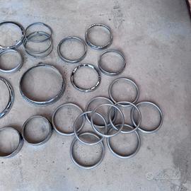 Stock di cornice fanale auto epoca cromate e in alluminio, alcune sono marchiate e altre non riportano loghi.