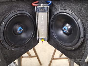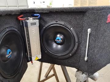 Vendesi sub wofer artigianale creato su misura per pianale fiat grande punto, la cassa è realizzata in mdf con fonoassorbente e rivestimento in tessuto traspirante, monta 2 wofer Ciare da 10" con potenza nominale di 250 watt RMS in parallelo, sistema in push-pull inverso chiuso per un basso molto duro! Regalo condensatore sounstream da 1Mhf con Amperometro e luci di corredo per un look tuning. Astenersi perditempo, chiamare solo se interessati, prezzo non trattabile e preferisco chiamate vocali non sms e no mail poiché vi rispondo con molto ritardo. Per qualsiasi info chiamare