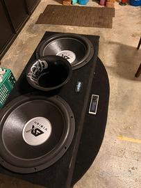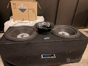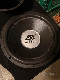 il box in questione monta due ESX Vision VE1522 15” da 38cm, uno singolo eroga fino a 4000 w rms, insieme possono raggiungere 8000w rms, piu cono per fuoriuscita del aria. ottimi per impianti audio ad elevate prestazioni. tenuti ed utilizzati maniacalmente. prezzo box completo 900€ leggermente trattabili. se interessati solo ad uno dei due coni senza il box , prezzo da stabilire in privato. per qualsiasi informazione non esitare a contattarmi.