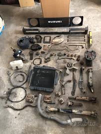 Vendo pezzi per Suzuki Samurai sj 413: traversa superiore, sportello dx, portello posteriore, supporto scorta, 1 cerchio in ferro, pannelli interni, tappetino rivestimento interno, strumentazione, fari anteriori, fanale post dx, devioluci, blocchetto accensione con chiave, kit serrature, servofreno, alternatore, ventola, albero trasmissione anteriore, albero trasmissione centrale, leva cambio, balestre posteriori, cavallotti post, radiatore con supporti e convogliatore, filtro aria, cavo apricofano, cavo frizione, parafanghetti plastica ant, fasce laterali e cric.