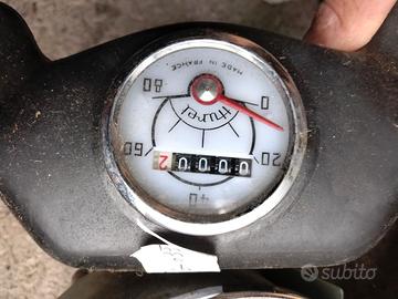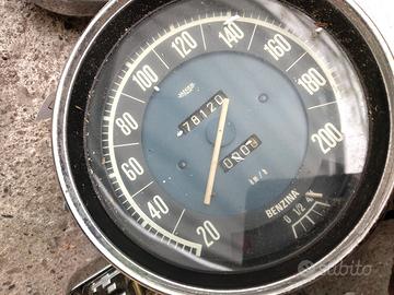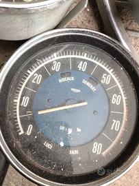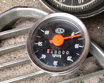 1. Tachimetri e Contagiri per Auto I due strumenti grandi circolari con fondo blu appartengono a un'Alfa Romeo Giulia (modelli come la TI o la Super): A sinistra: Un tachimetro/contachilometri con scala fino a 200 km/h. Include anche l'indicatore del livello della benzina. A destra: Un contagiri che arriva a 8.000 giri/min. Presenta diverse spie di servizio (Generatore, Riscaldamento, Fari). 2. Tachimetro per Ciclomotore (in alto) Lo strumento circolare più piccolo in alto è un tachimetro CEV, tipicamente montato su ciclomotori italiani degli anni '60 e '70 (come Moto Guzzi, Garelli o Minarelli). Ha una scala fino a 60 km/h. 3. Strumento con supporto in plastica (in basso) In primo piano c'è un tachimetro montato su una struttura in plastica nera. Il logo al centro sembra quello di un Piaggio Ciao o di un altro ciclomotore Piaggio della serie "Teen" o simili.