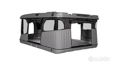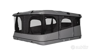 Si differenzia dalle altre tende del brand per il suo tetto, studiato per poter caricare fino a 25Kg grazie al suo disegno e agli anelli di ancoraggio che permettono il fissaggio dei bagagli.