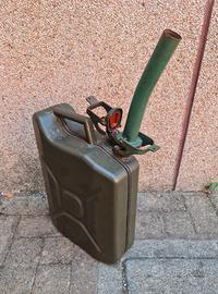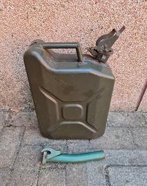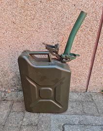 Tanica in metallo per il trasporto di carburanti, da litri 10, di colore verde completa di beccuccio in metallo in tinta con la tanica. In buone condizioni.