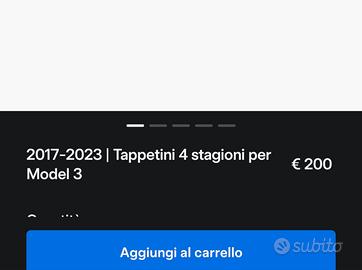 Vendo Tappetini 4 stagioni per model 3 pre highland, 2017-2023, ma che sono compatibili anche con model 3 highland(2023-2026). Originali Tesla. Usati ma in ottime condizioni. Prezzo sullo shop Tesla 200.00€(allego foto dell'articolo nello shop), vendo a 100.00€ Consegna a mano nelle province di MB, BG, LC, MI.