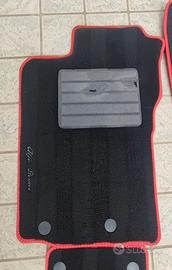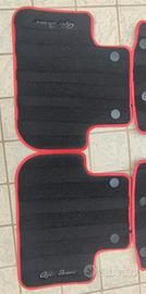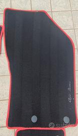 vendo tappetini per Alfa Romeo 147 (5 porte) personalizzati, realizzati in moquette nera con bordo in tessuto rosso, cuciture con scritte Alfa Romeo e battitacco grigi