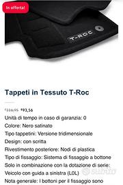 Vendo set di tappetini originali Volkswagen per T-Roc in tessuto versione tridimensionale Optimat (con bordini rialzati) in condizioni eccellenti.