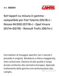 Applicabilità marca: Altro Applicabilità modello: Altro Set di tappeti su misura in gomma. Compatibile con Fiat talento (05/16) Nissan nv 300(07/16) Opel Vivaro (01/14>02\19) Renault traffic (06/14>)