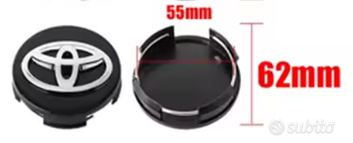 Vendo per errato acquisto 4 tappi copertura mozzo ruota con stemma Toyota silver su sfondo nero. Il diametro esterno è 62mm