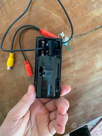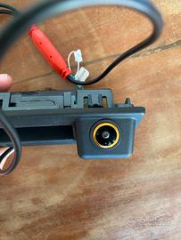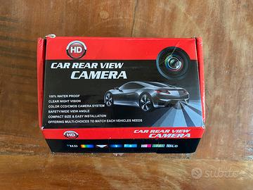 Questa è una telecamera posteriore per auto in alta definizione (HD), progettata per migliorare la sicurezza e la visibilità durante le manovre di retromarcia. Il prodotto è confezionato in una scatola con una grafica in rosso e nero, e le seguenti caratteristiche principali sono evidenziate: