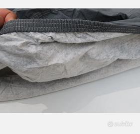 Telo copriauto felpato PVC grigio impermeabile/antistrappo/antigelo. Bordi doppie cuciture, angoli con elastico, gancio centrale per fissaggio.