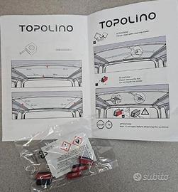 Tendina parasole del vetro del tetto panoramico della Fiat Topolino.Specifica per la Fiat Topolino dal 2023.Protegge i passeggeri dai raggi solari.Materiali : Tela di poliestere e filo d'acciaio a memoria di forma e sagomata come il tetto.Colore: nero.Fornita ripiegata in un sacchetto di nylon nero con il logo ''Topolino'' scritto in bianco.Non occorre forare la vettura ma viene fornita con 5 agganci ( 1 di scorta) che si fermano con biadesivo ai 4 lati del tetto.Si monta in 5 minuti. Dimensioni aperta : 400 x 400 mmDimensioni da chiusa : 400 X 25 mmP/N : 50291208La trovi qui : https://abarthparts.it/index.php/tendina-parasole-topolino.html