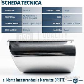 Terminale di Scarico Sportivo per Seat Leon 1P, in ACCIAIO Cromato Inossidabile SS304 | Taglio a Fetta di Salame | Installazione Facile ad Incastro PLUG & PLAY. - Look d' Impatto, Scarico Cromato - Installazione Facile, PLUG & PLAY - Alta Resistenza Alla Corrosione e Decoloramento - Eccellenza dei Materiali """"Dettagli/Tatto"""" COMPATIBILITÀ: - Per SEAT LEON 1P (2005-2012), con Singolo Scarico a Sinistra ACCIAIO INOX SS304: L' Acciaio Inox SS304 Rappresenta uno dei più Costosi Acciai in commercio, il Famoso ""18-10"" del Servizio di Posate o Pentole. E' un Acciaio Austenitico, poichè contiene un alto livello di Cromo, Esattamente il 18%, e l'8% di Nichel; le Propietà Fondamentali Sono: - Eccellente Nella Resistenza Alla Corrosione - Facilità di Ripulitura, Lucidatura ed Coefficente Igenico - Altissima Facilità di Lavorazione o Saldatura - Non è Particolarmente Magnetico TRASFORMAZIONE MARMITTA: Lo Scarico Cromato Tondo da All' Auto un Look Sportivo, Completamente Rinnovato INTALLAZIONE PLUG & PLAY: Facendo Scorrere Il Vecchio Scarico in Quello Nuovo, fino al punto di Incastro. Dettagli Tecnici - Materiale : Acciaio INOSSIDABILE - Sezione: Tondo - Taglio Obliquo: Si, a Fetta di Salame - Colore: Cromato - Finitura: Cromo - Peso: 0,224 Kg - Dimensioni: LUN da 120 a 140 mm - Metallo Composto: 18% Cromo, 8% Nichel - Magnetismo: No - Basso - Confezionamento: Box Cartone Originale - Resistenza alle Intemperie: ELEVATA - Bloccaggio: a Incastro - Lavorabilità: Eccellente (si Presta alla Saldatura) PER INFO CONTATTARE AL 3927091031 ANCHE LINEA WhatsApp OPPURE VIA E-MAIL: rtautoitalia2018@libero.it CONSEGNA: - Effettuiamo Spedizioni 24-48H in TUTTA ITALIA - Consegne a Mano con possibilità di visionare il Prodotto - Vendiamo solo Articoli Nuovi PAGAMENTI: - PayPal - Con Carta - Bonifico Bancario - Alla Consegna con Contrassegno